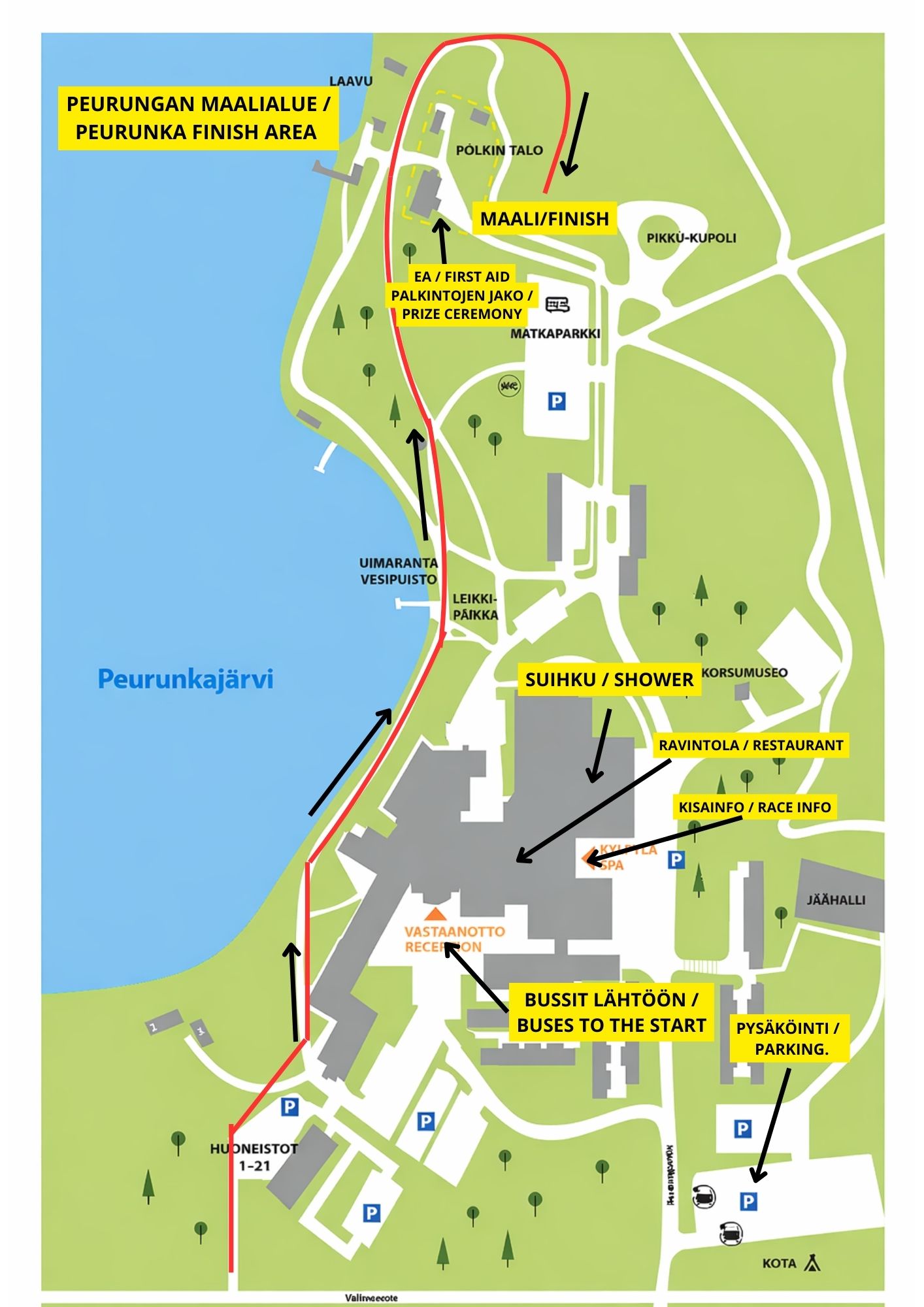 The 45km and 35km routes start from the Vaajakoski sports field and the finish line of both routes is located in the spa hotel Peurunka. The departure of the 10 km route takes place at the Vihtavuori. Address will be informed later.